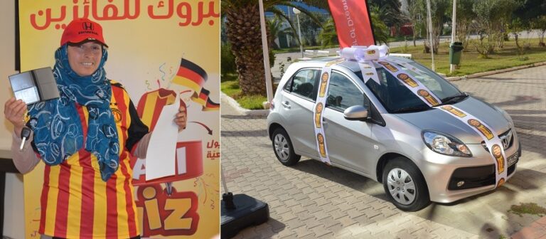 Parmi les vainqueurs du jeu, la chance a souri le plus à une heureuse gagnante. Venue vêtue du maillot de l’Espérance et le sourire timide aux lèvres, elle a remporté 5 maillots, un lot de 1000 dinars et la voiture Honda, tous à la fois !