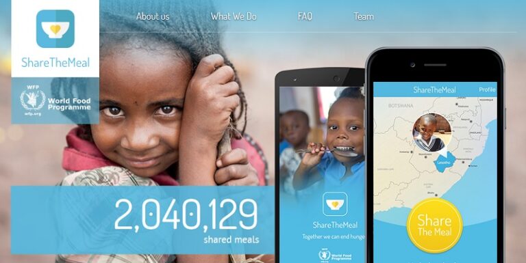 « ShareTheMeal » propose une plateforme sur laquelle les utilisateurs peuvent, d’un clic, donner de quoi nourrir un enfant pendant une journée (40 centimes), une semaine (2,80 euros), un mois (12 euros)…
